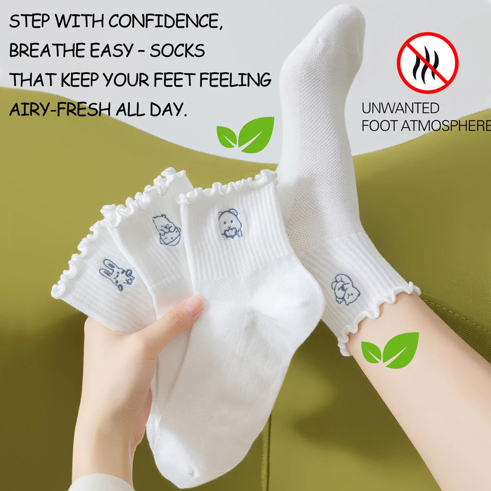 6 Pairs White Lightweight Spring Summer Socks Women's Cotton Socks — Bazaar Hub signature mid-crew socks with cartoon embroidery and ruffle trim.