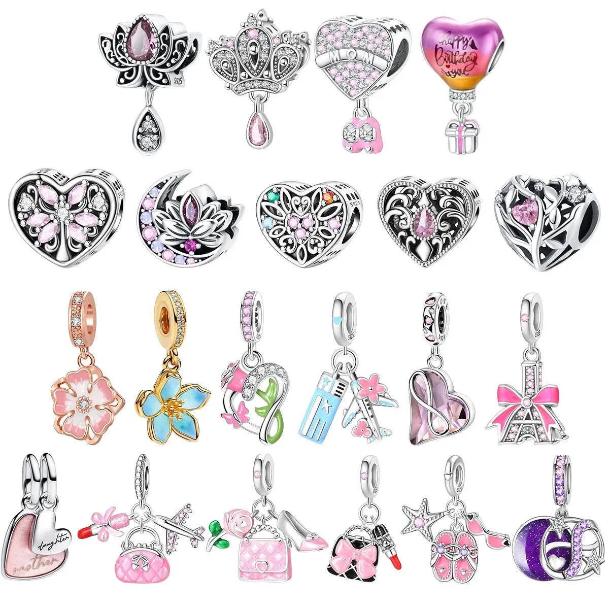 Sterling Silver Pink Blossom Dangle Charm with Butterfly Heart Flower Rose and Bird Bead for DIY Necklace and Bracelet Jewelry