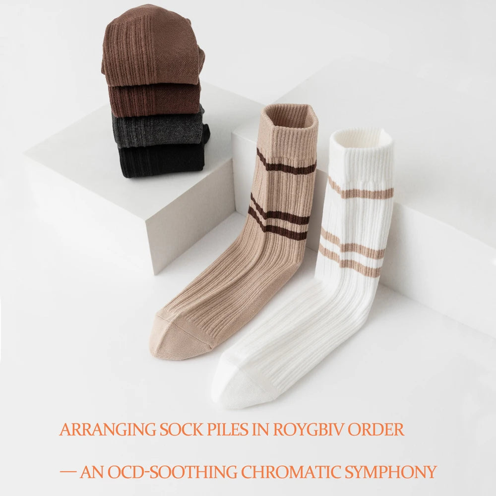 3 Pairs Retro Athletic Mid-Calf Socks Women by Bazaar Hub — double-knit striped design in Maillard tones for odor-free stretch comfort.