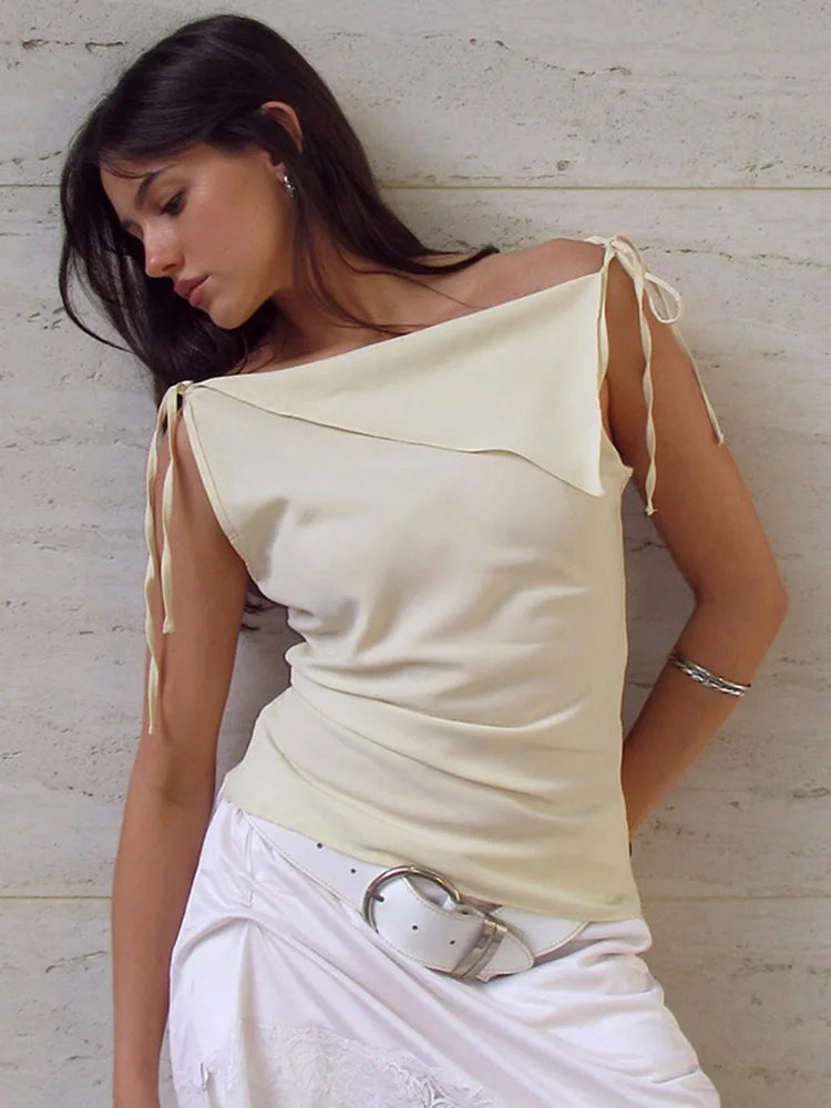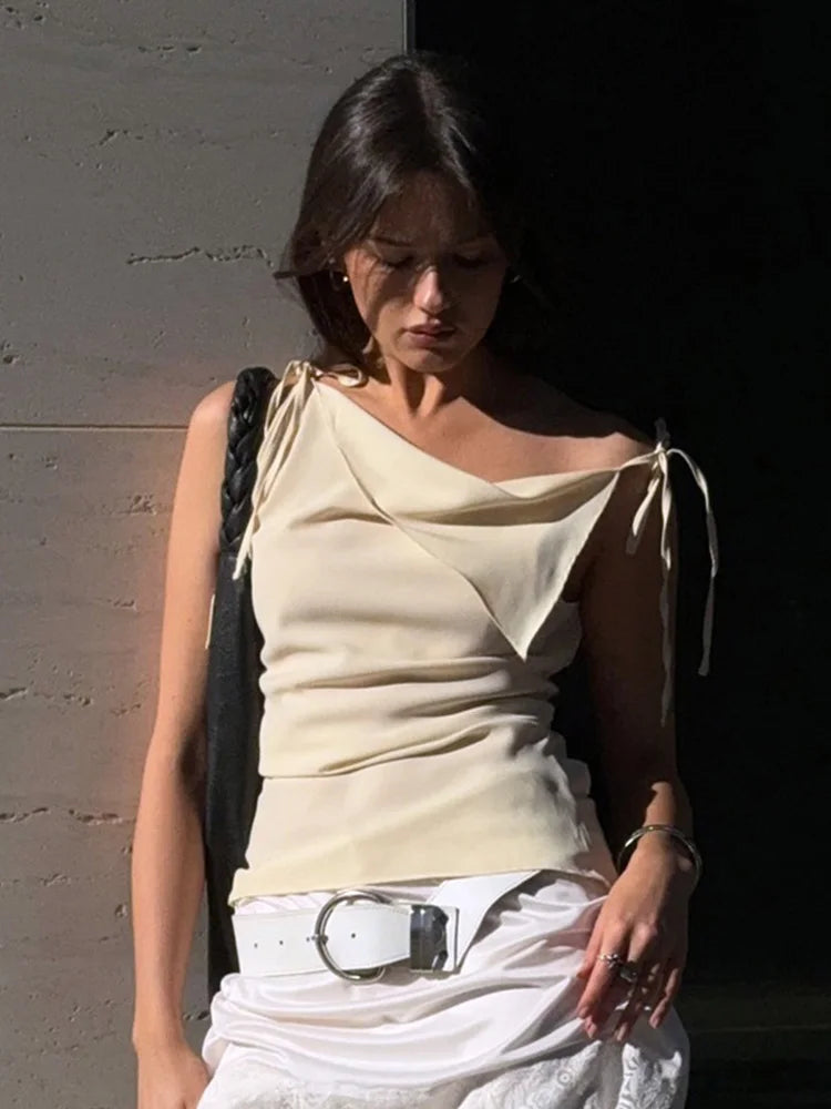 Lace-up Double-layer Irregular Tank Tops Women Summer 2025 Casual Camisole Sleeveless Shirts by Bazaar Hub — lightweight knit broadcloth with cotton-polyester blend for slight stretch and breathable comfort.