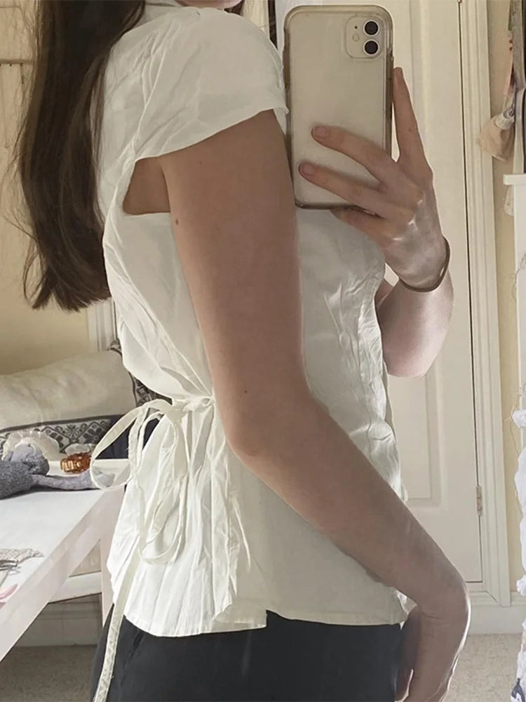 White Tie Up T Shirt y2k Women Short Sleeve Turn Down Collar Button Crop Top — a retro-inspired essential that elevates casual summer looks with a sleek, cropped silhouette.