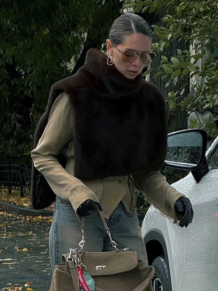 Solid Color Half Turtleneck Furry Sleeveless Patchwork Top