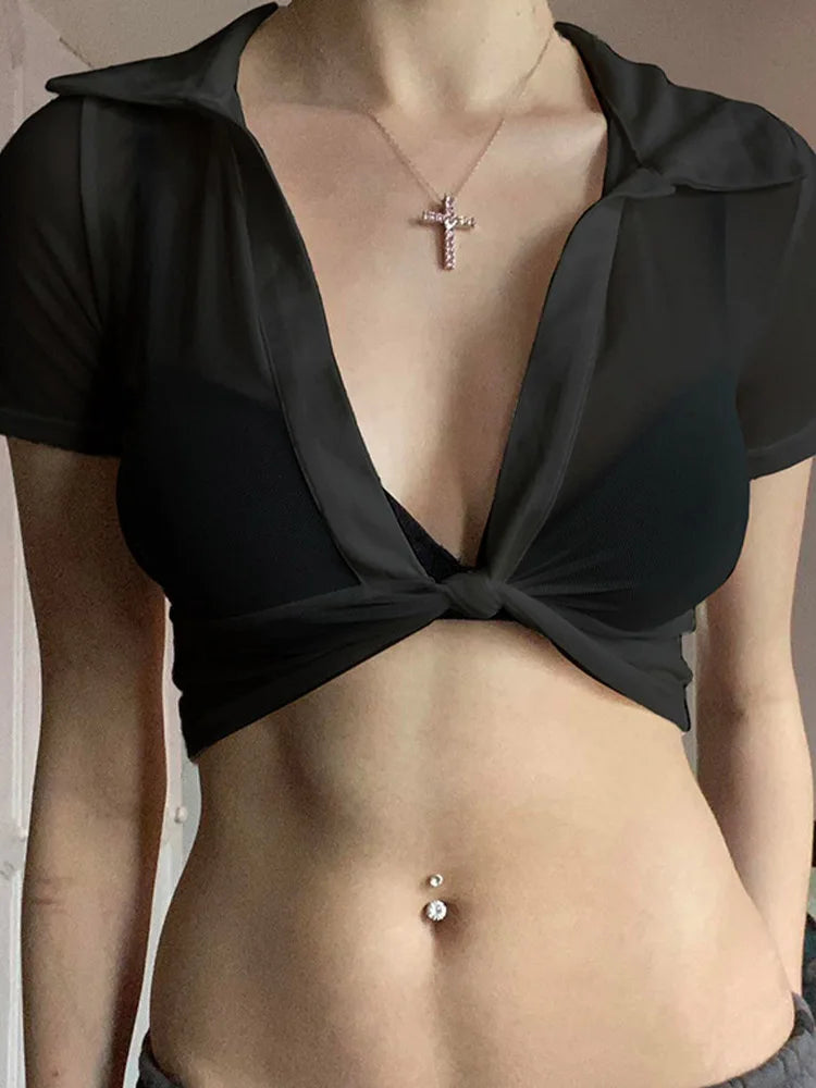 Women's Transparent Mesh Crop Top Short Sleeve V-Neck See through T-Shirt Y2K Streetwear Casual Club Party Sexy Split Tees