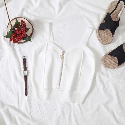 Women Crop Top Club Sexy Zipper Knitting Camisole With Hole Female Tank Tops Ladies Sleeveless Solid Simple Tops Women by AOWOFS delivers a breathable knit with a bold zipper detail for stylish club nights and everyday summer wear, showcased from multiple angles in the product images.
