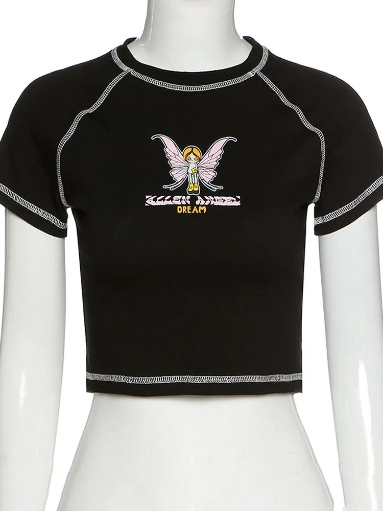 Butterfly Graphic Green Letter Print Crop Top O-Neck Tee