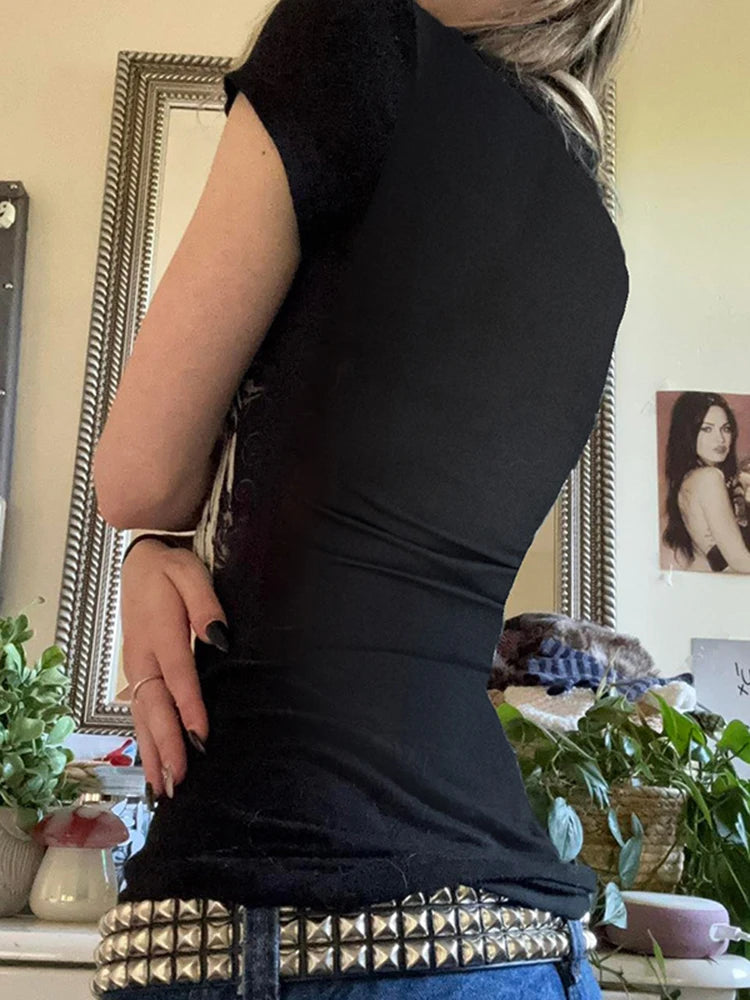 Casual Dark Printed T Shirt Basic Slim O-Neck Short Sleeve Tees Women 2025 Summer Fashion Streetwear Grunge Fairycore