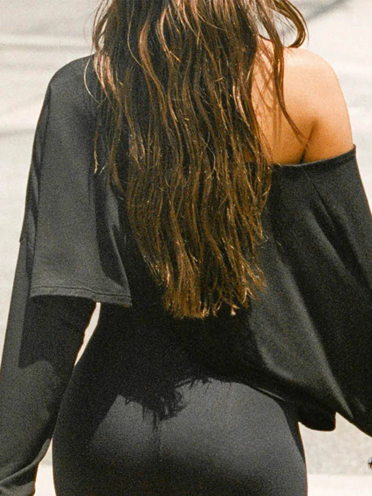 The gallery highlights the top from multiple angles, showcasing its off-shoulder drape, cropped silhouette, and relaxed long sleeves designed for easy layering.