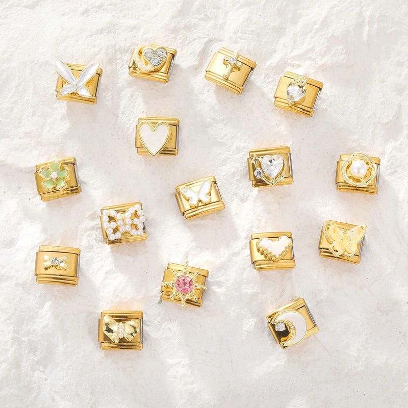 Introducing the Golden 3D Charm Bow Crown Flowers Pearls Italian Charm Links, exclusively from Bazaar Hub. Elevate your style with these exquisite 9mm bracelet charms, crafted from premium stainless steel for unmatched durability and shine.