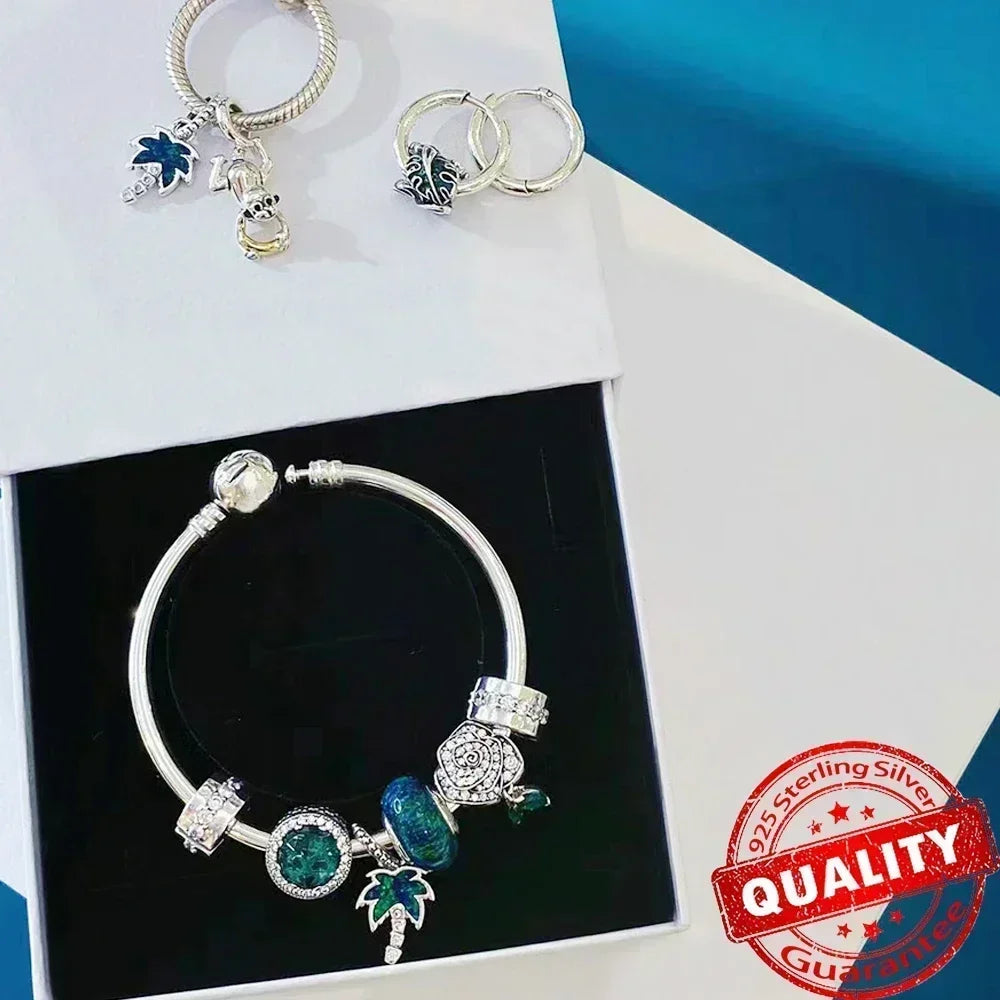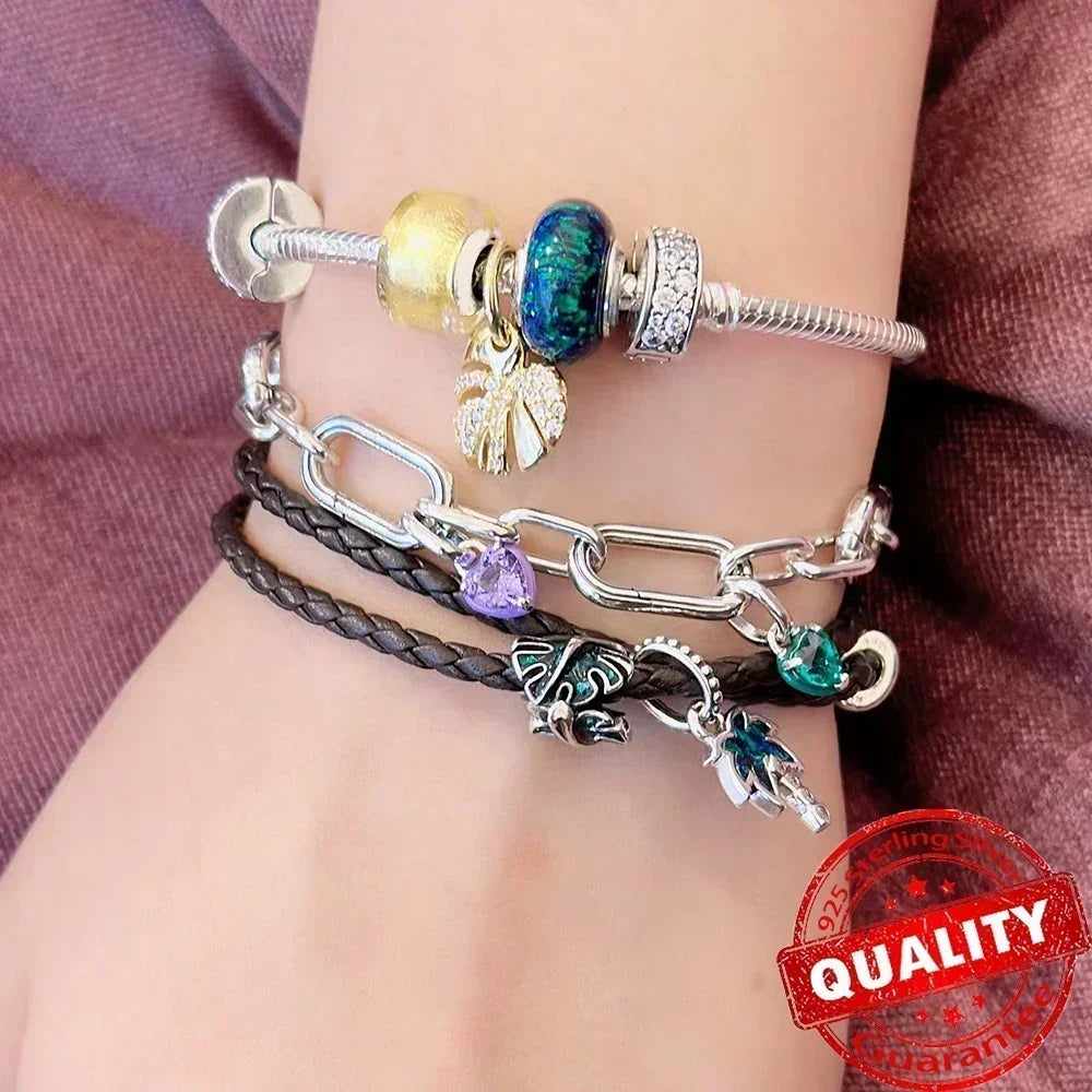 Green Monstera Leaf Charm 925 Sterling Silver Dangle Bracelet Jewelry for Women