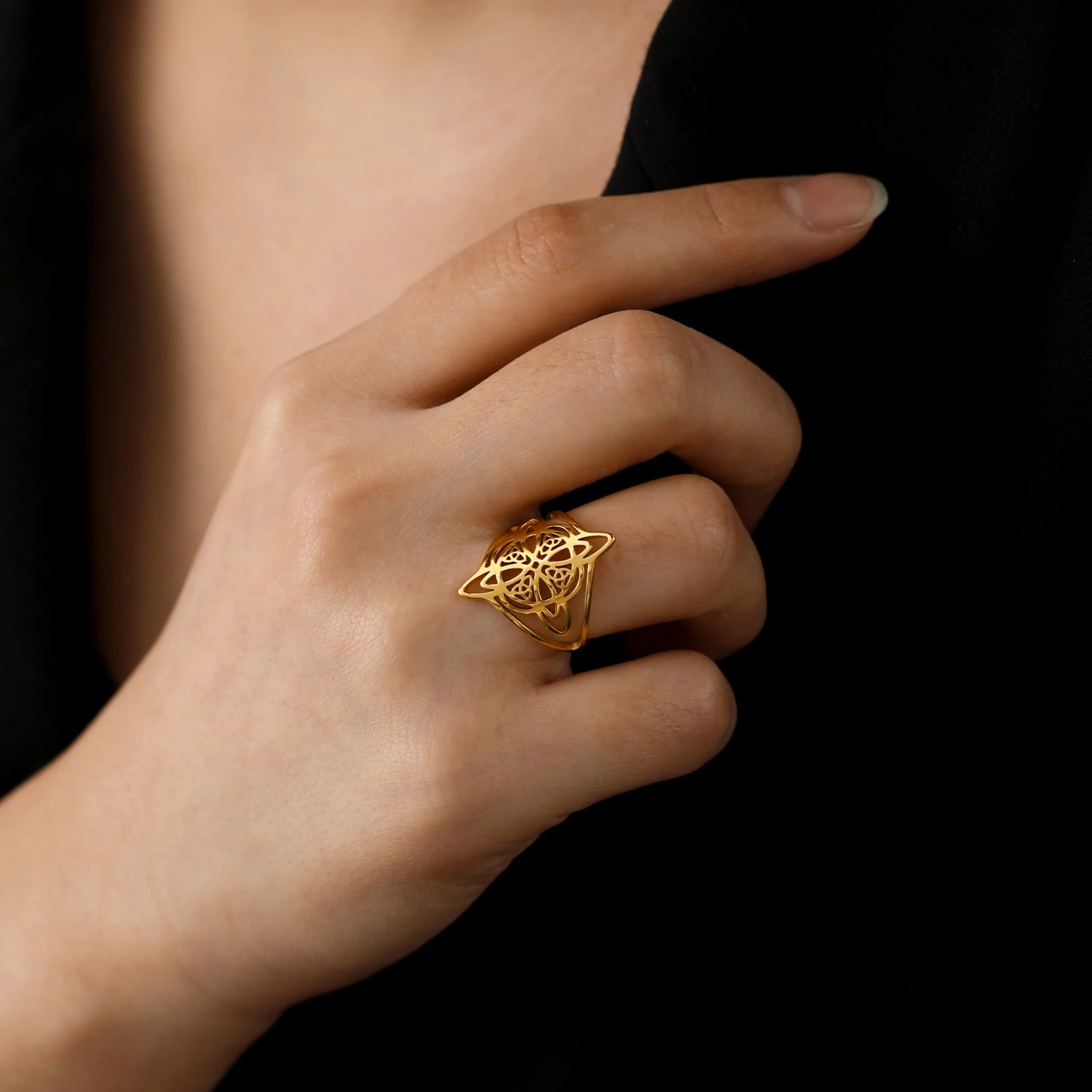 Discover the enchanting Skyrim Witchcraft Stainless Steel Witch Knot Ring, a perfect blend of style and spirituality. Crafted with precision, this Wicca Triquetra ring boasts a stunning 18k gold plating, making it a captivating accessory for both men and women.