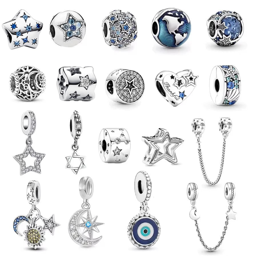 Fit Original 925 Sterling Silver Pan Bracelet — Pavé asymmetric star & crescent moon charm with galaxy safety chain by Bazaar Hub.