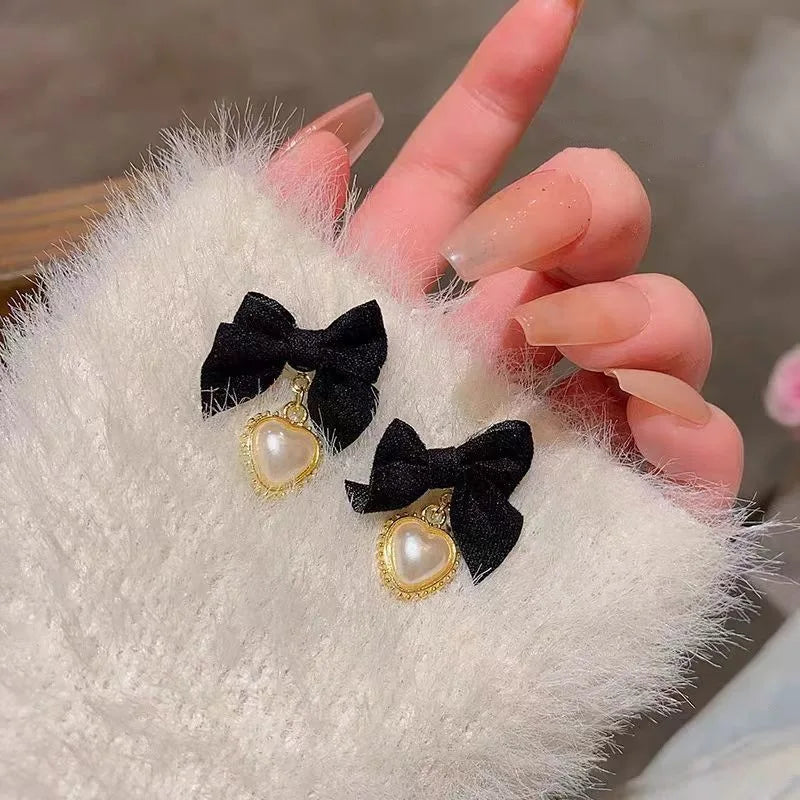 Autumn Charm Black Bowknot Pearl Heart Pendant Earrings for Women Vintage Fashion