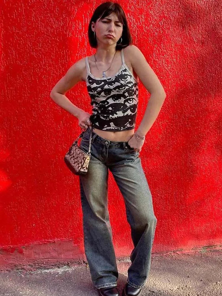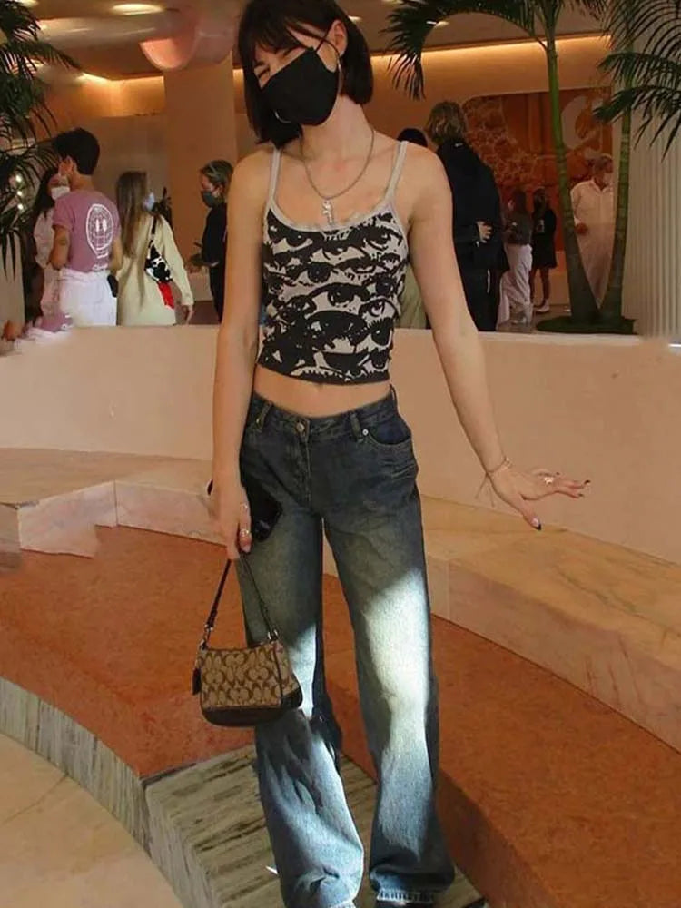 Gothic Portrait Print Tee Y2K Crop Top With White Suspenders